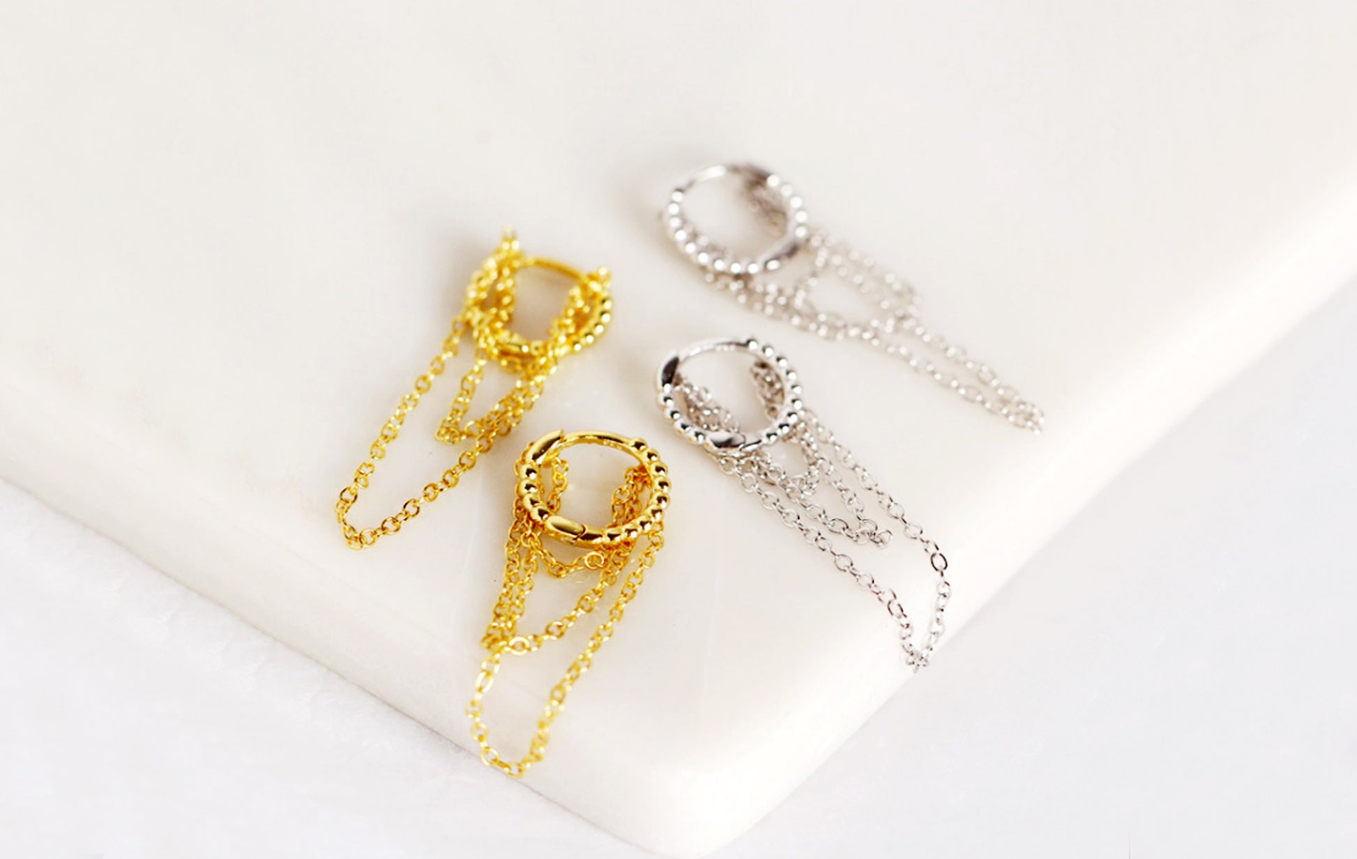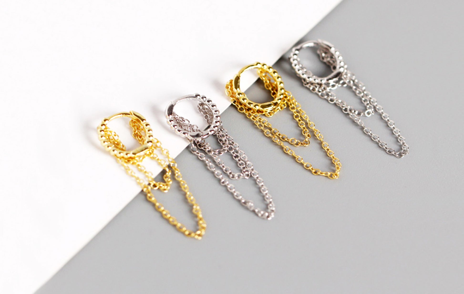 These chain drop twist hoop earrings are crafted from 925 sterling silver and finished with luxurious 18k gold plating. Designed with a small 10mm twisted hoop and a fine chain drop, they add movement and texture while remaining lightweight and easy to wear. Ideal for stacking earrings or styling in multiple piercings, these gold chain hoop earrings are a timeless choice for modern, minimalist jewellery lovers.