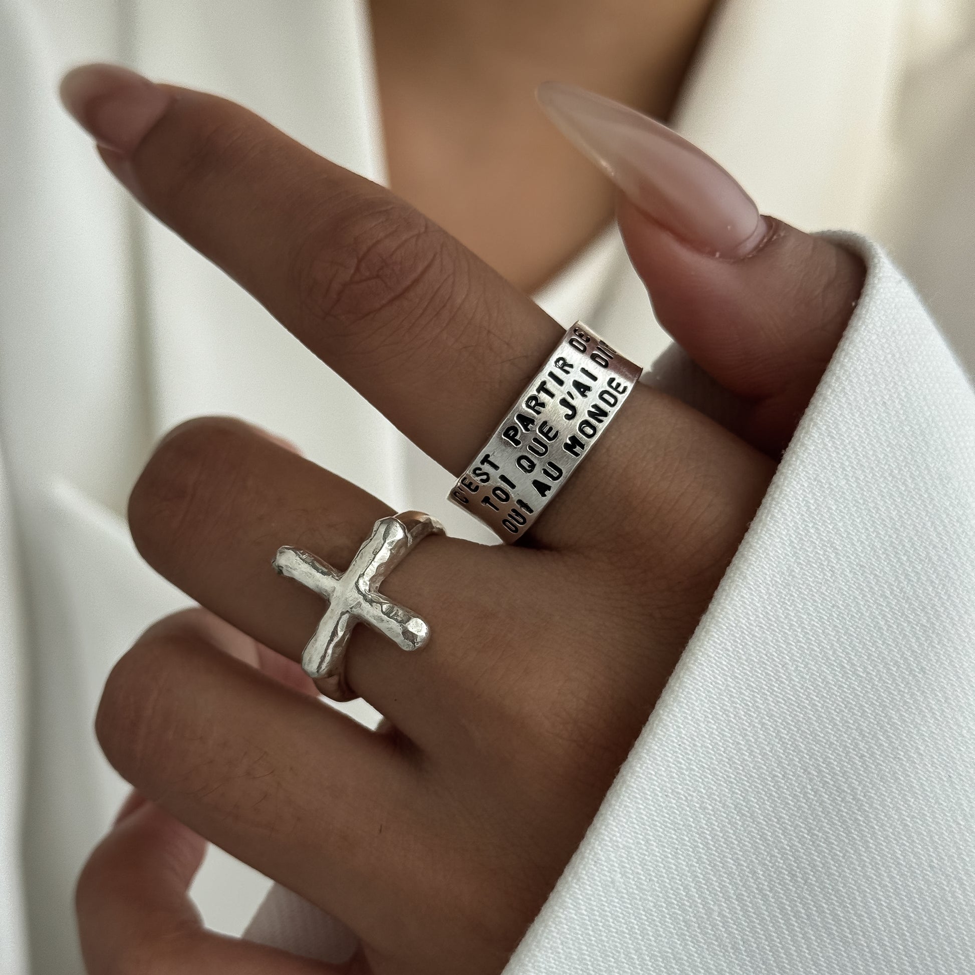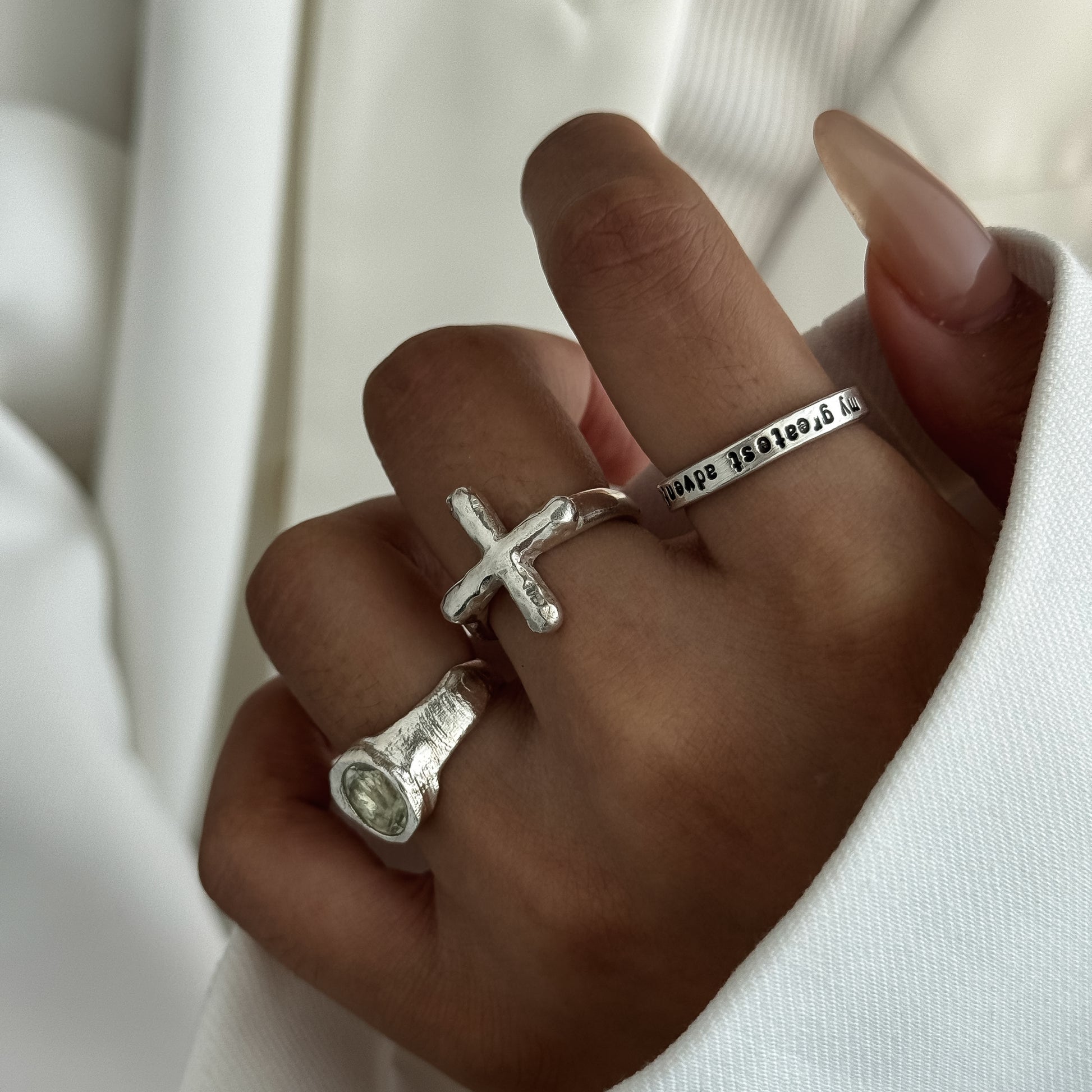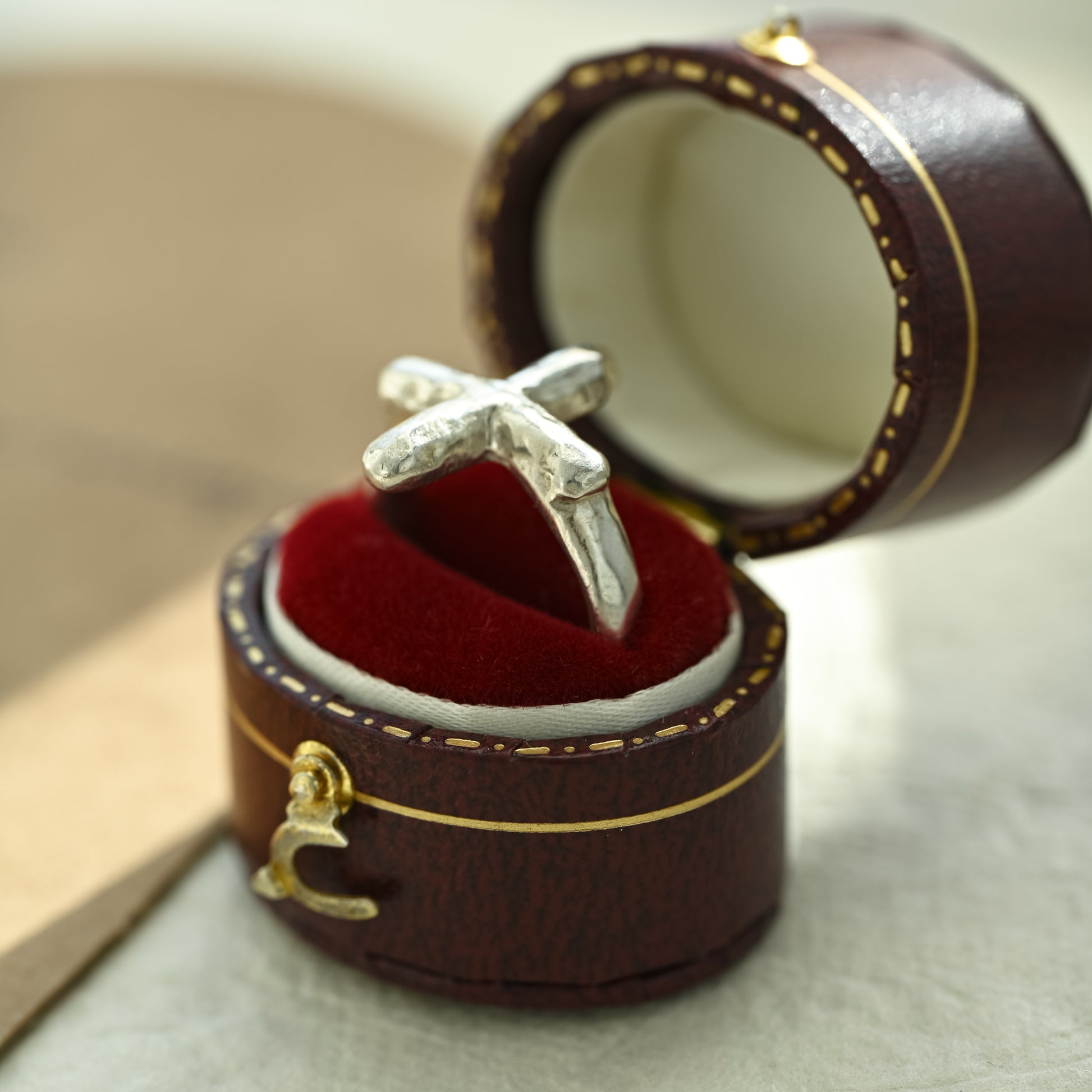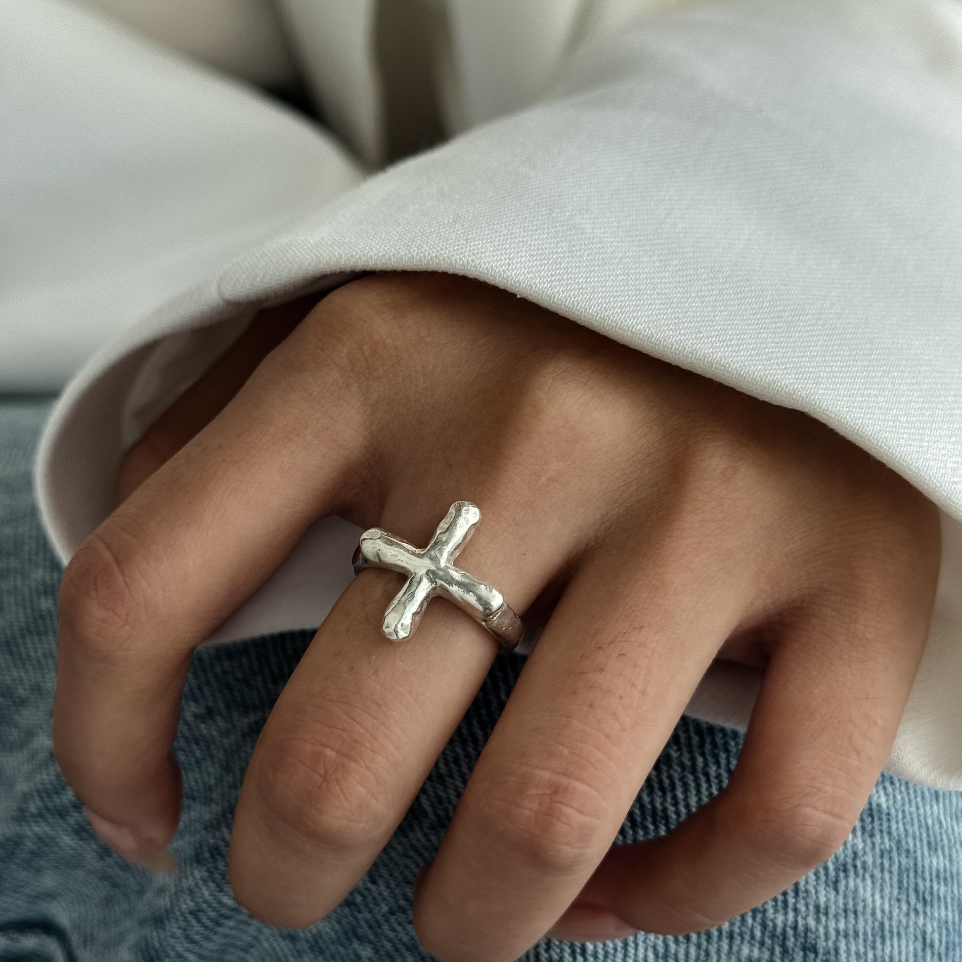 The Hand-Hammered Cross Ring brings a touch of raw elegance to any outfit. Pair it with other textured silver bands for a layered, bohemian-inspired look, or wear it solo for minimalist strength. Its unrefined beauty makes it a versatile piece for both casual and elevated styling.